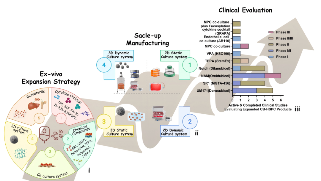 在技术创新层面,小分子化合物如SR-1、UM171、烟酰胺(NAM)等应用取得了突破性进展,3D培养系统通过仿生微载体、水凝胶、纳米支架等生物材料,模拟骨髓微环境,为干细胞功能维持提供更理想培养条件。综述直面产业化挑战,深入分析了从实验室到临床转化的关键问题,讨论了从传统培养瓶到培养袋、G-Rex体系,再到动态生物反应器的持续创新。